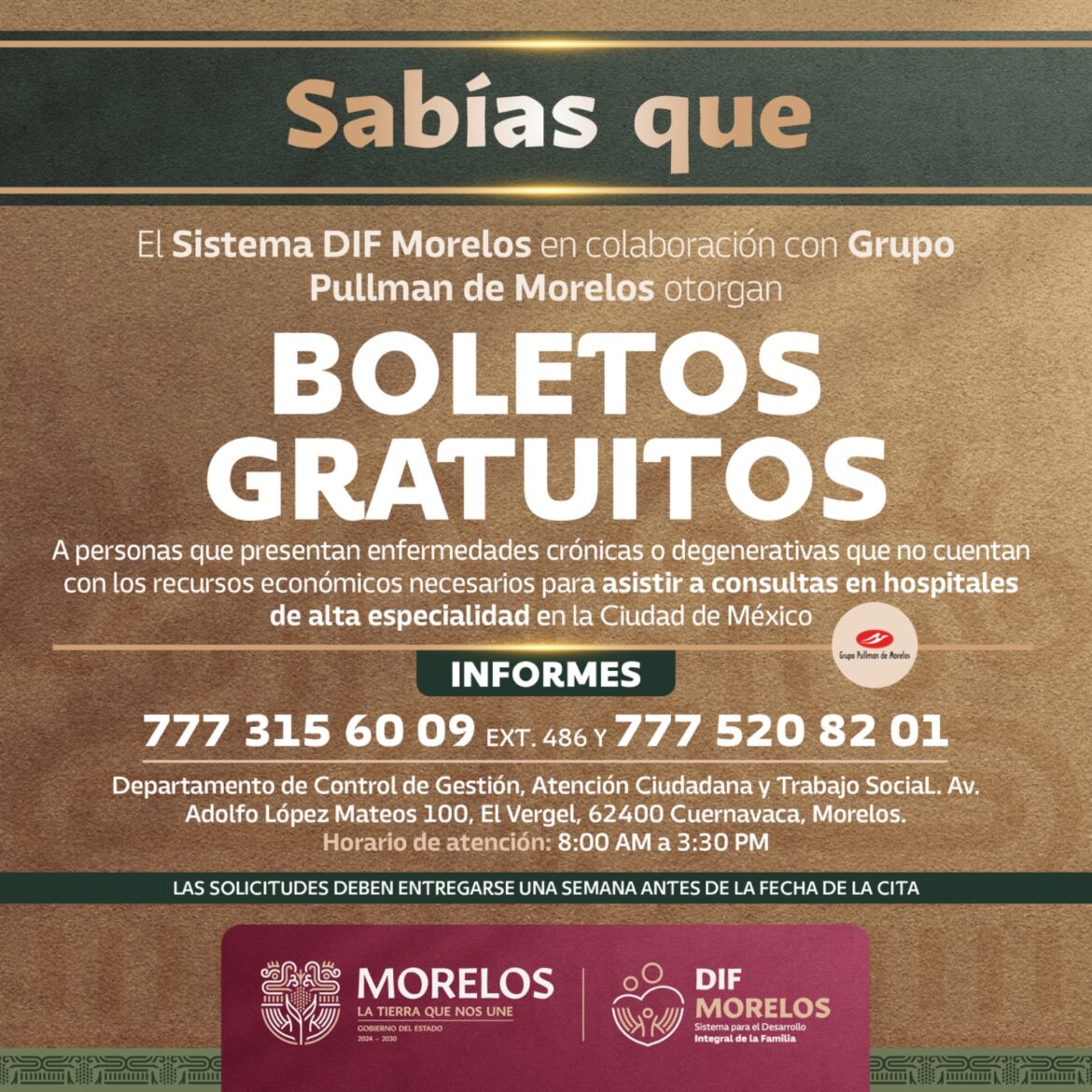 El Sistema para el Desarrollo Integral de la Familia del Estado de Morelos (SEDIF), a través de la Coordinación de Enlace Institucional, en colaboración con Grupo Pullman de Morelos, otorga boletos gratuitos para personas con enfermedades crónicas o degenerativas, que no cuentan con los recursos necesarios para asistir a consultas a hospitales de alta especialidad en la Ciudad de México.