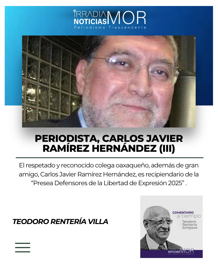 El respetado y reconocido colega oaxaqueño, además de gran amigo, Carlos Javier Ramírez Hernández, es recipiendario de la “Presea Defensores de la Libertad de Expresión 2025” que anualmente en la ceremonia conmemorativa del Día de la Libertad de Prensa y Expresión -7 de junio-, que se desarrolla al pie del Monumento dedicado a esas libertades primarias en la ciudad-capital, Cuernavaca, otorgan por los méritos de los galardonados, el Consejo Cívico Ciudadano de Morelos y la Asociación de Comunicadores y Periodistas de Morelos, APECOMOR, que presiden el profesor y licenciado, Pablo Rubén Villalobos Hernández y el maestro, Teodoro Raúl Rentería Villa, respectivamente.
