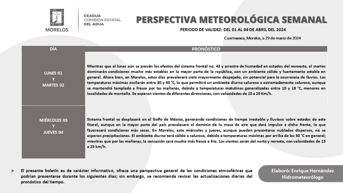 La Comisión Estatal del Agua (Ceagua) emite la perspectiva meteorológica referente a las condiciones que prevalecerán para la primera semana del mes de abril, en el que persistirá un ambiente cálido a muy caluroso a lo largo del día, con cielo mayormente despejado y sin potencial para la ocurrencia de lluvias.