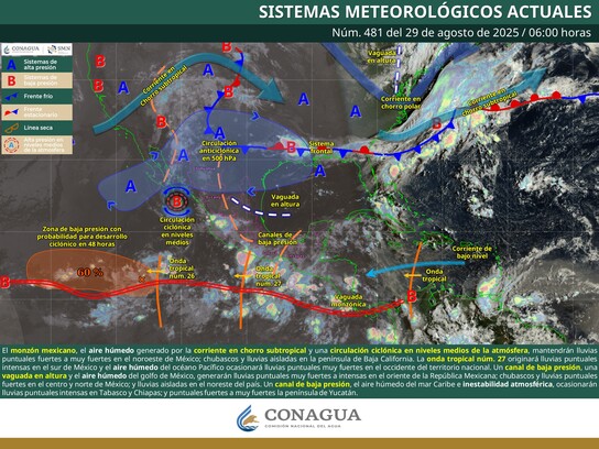 Para este viernes 29 de agosto se esperan condiciones de cielo medio despejado con temperaturas matutinas y nocturnas frescas, con una posible recuperación de las temperaturas máximas oscilando de cálidas a calurosas de 30 a 33° C al sur del estado.