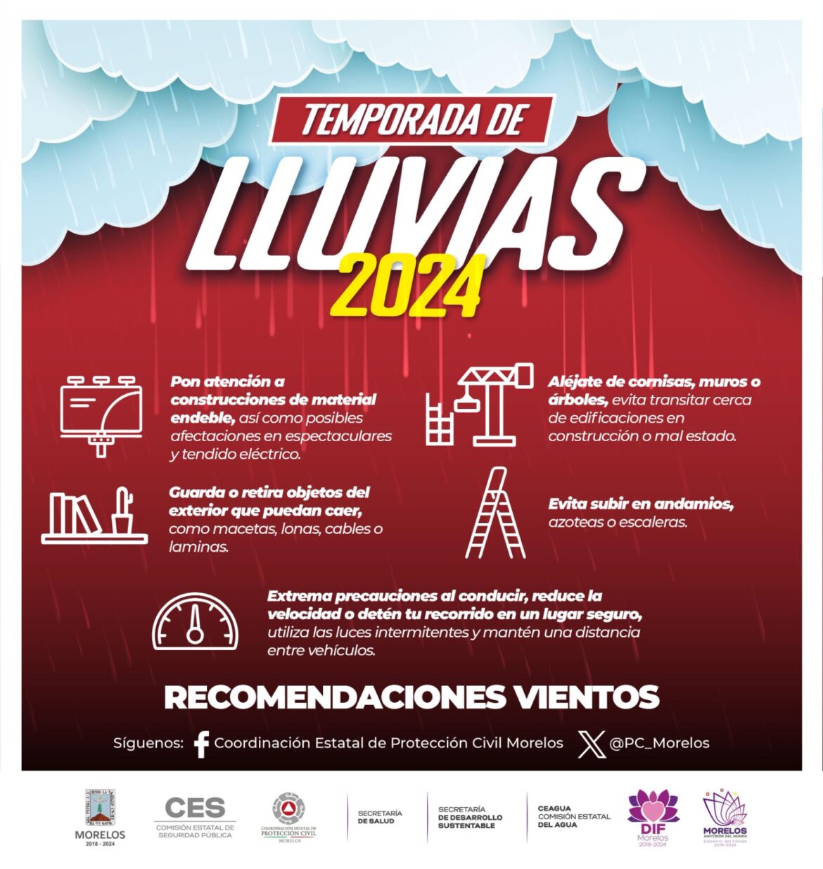La Coordinación Estatal de Protección Civil Morelos (CEPCM) emitió diversas recomendaciones a las y los ciudadanos para evitar alguna afectación ante los fuertes vientos que podrían registrarse en esta temporada de lluvias.