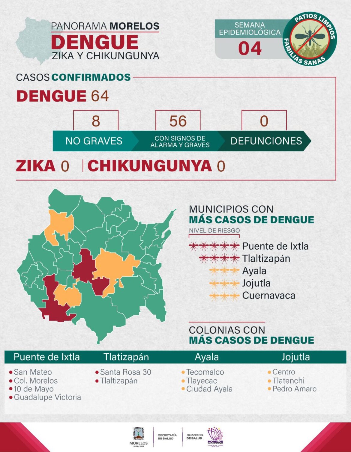 Sesma Medrano detalló que a la semana epidemiológica 04, se han registrado 64 casos de dengue, ocho clasificados como no graves y 56 con signos de alarma y graves; así como, cero casos de zika y chikungunya.