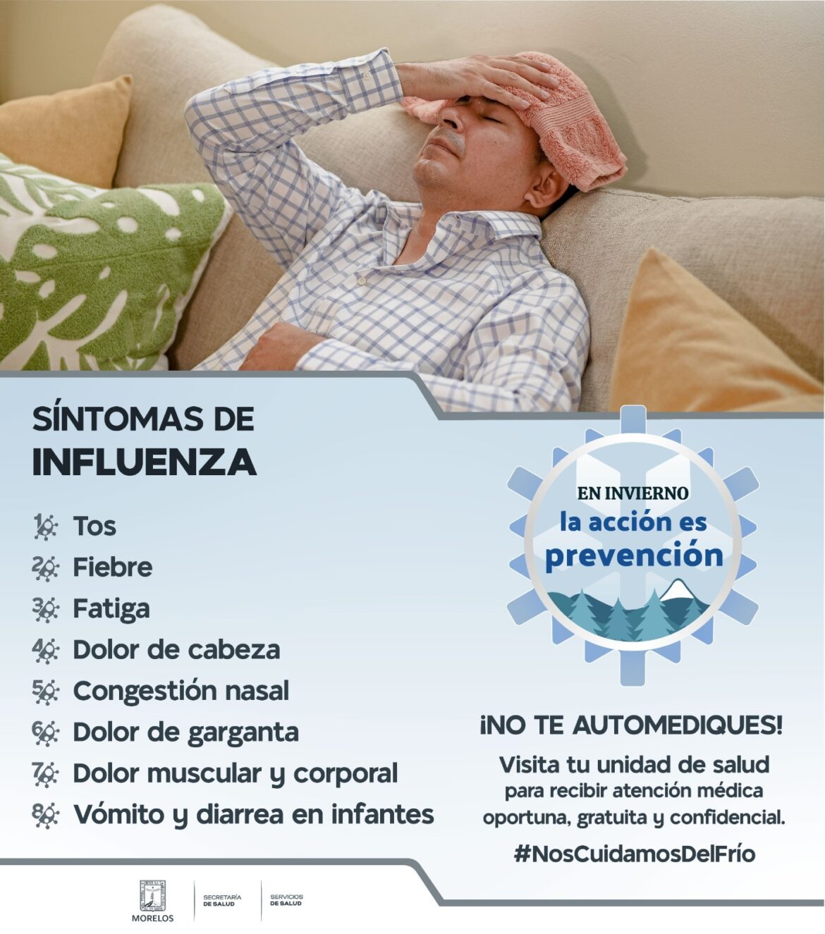 Servicios de Salud de Morelos (SSM) insistió a la población, principalmente a grupos vulnerables, estar atentos a síntomas de influenza, ya que si bien, se registran altas temperaturas en la entidad, es prioritario tomar las medidas preventivas.