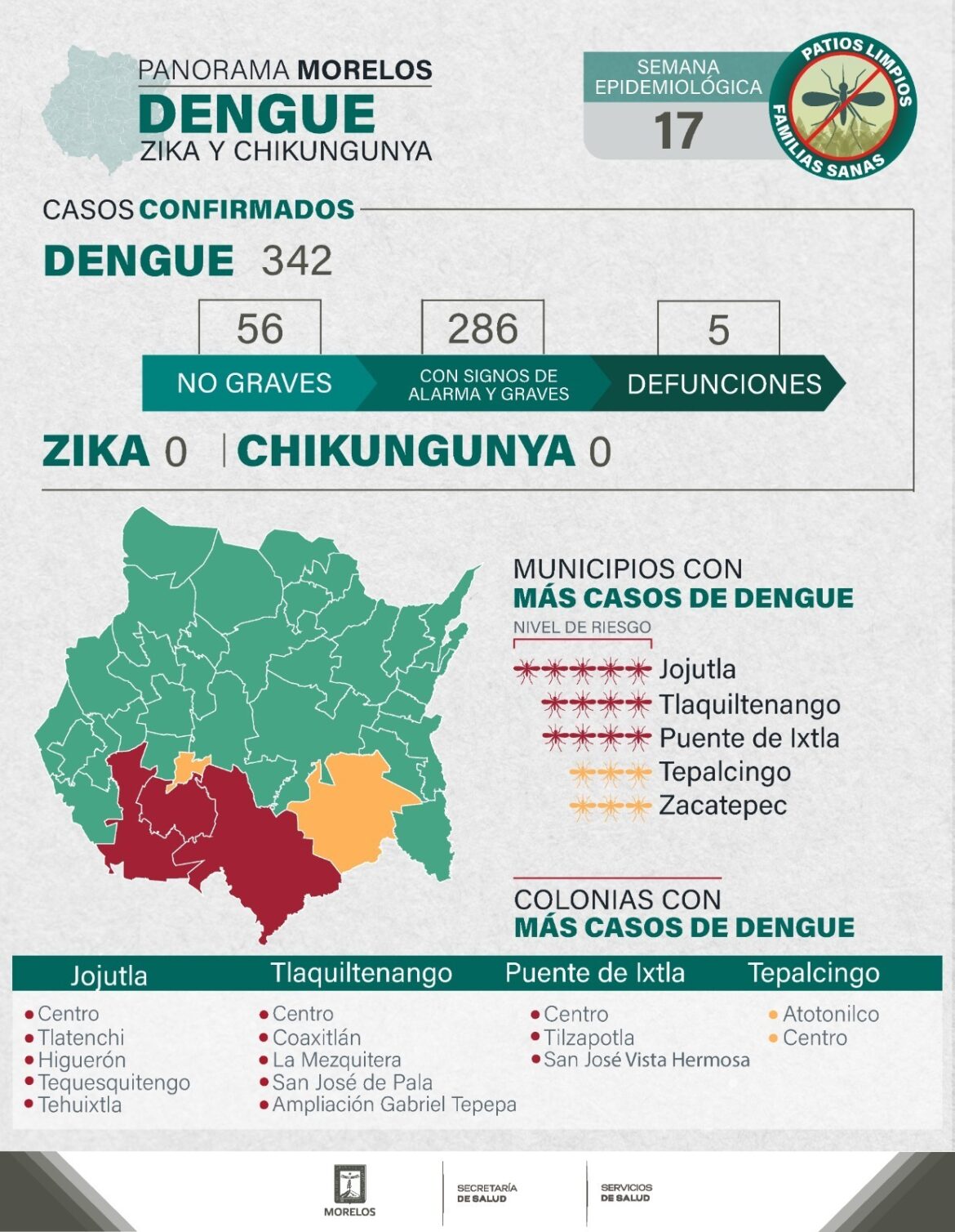 A la semana epidemiológica 17, se han registrado 342 casos acumulados de dengue del sector salud, de los cuales 56 están clasificados como no graves y 286 con signos de alarma y graves; así como, cinco lamentables defunciones; hasta el momento no se tienen registrados casos de zika y chikungunya.