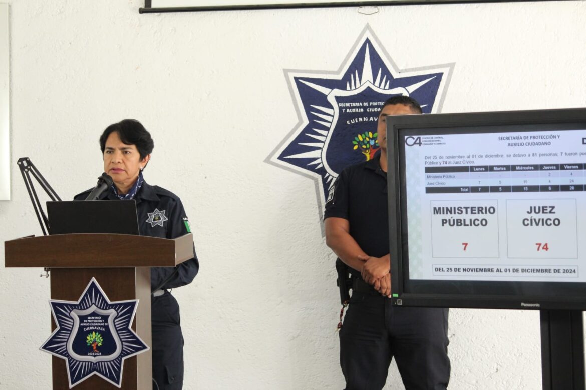 Y es que, resaltó que del 25 de noviembre al 01 de diciembre detuvieron a 81 personas, de las cuales 74 fueron puestas a disposición del Juez Cívico y siete al Ministerio Público, entre ellas Carlos Andrés “N” en la colonia Altavista por su probable participación en el delito de violencia familiar en virtud de recibir una llamada para señalar que estaba golpeando a una mujer.