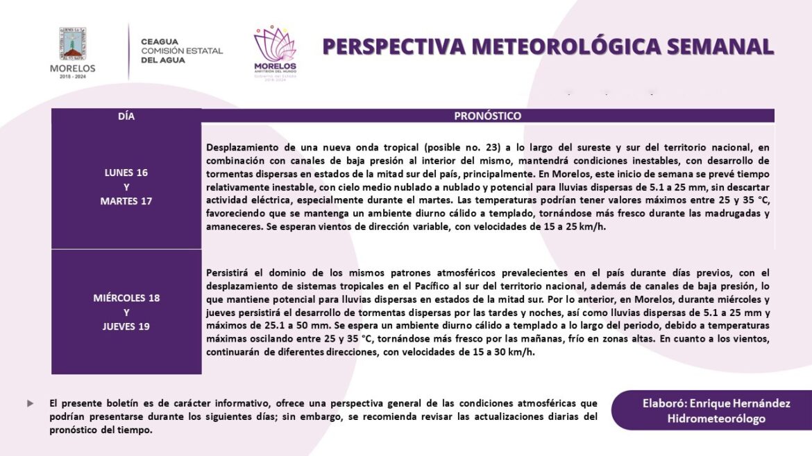 La Comisión Estatal del Agua (Ceagua) emite la perspectiva meteorológica para el periodo del 16 al 19 de septiembre en el que se prevén condiciones de tiempo variable, con posibles lluvias y chubascos por la tarde y noche. El ambiente será templado a cálido durante el día, fresco por la madrugada y al amanecer.