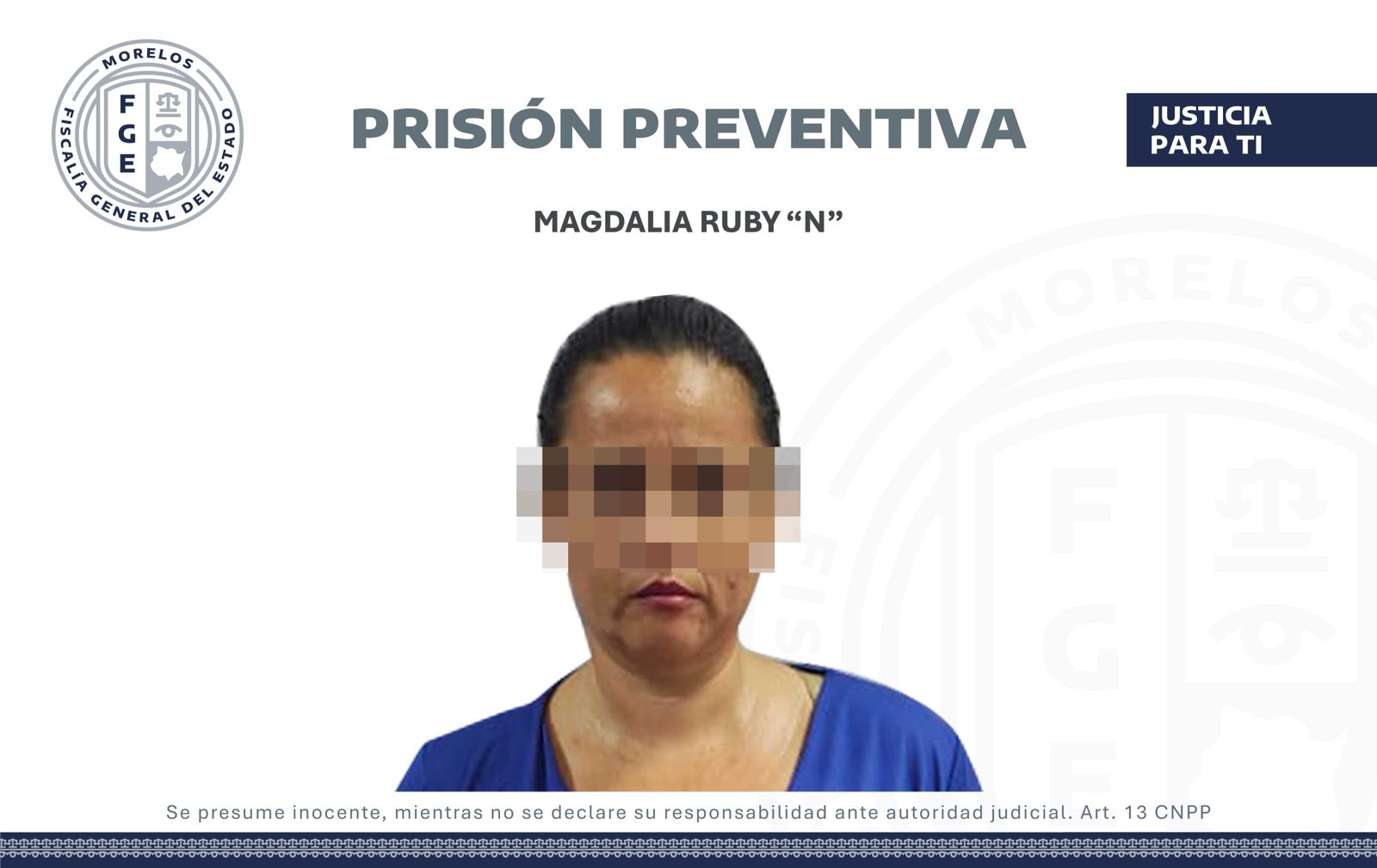 La Fiscalía Regional Sur Poniente obtuvo de un juez de control prisión preventiva en contra de Magdalia Ruby “N”, por la probable comisión del delito de homicidio calificado, en hechos suscitados en el municipio de Tlaquiltenango.