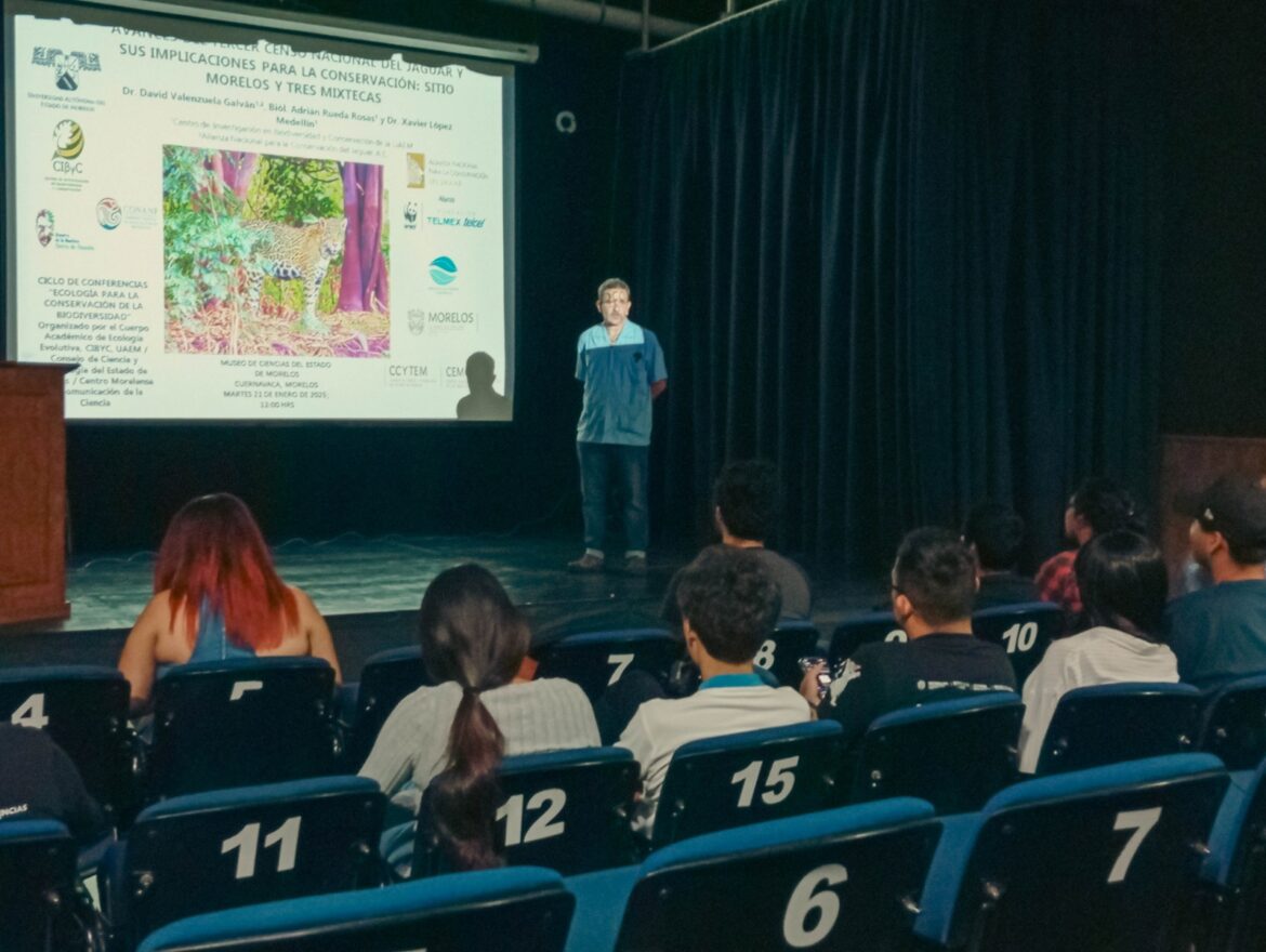 La primera exposición, titulada “Avances del tercer censo nacional del jaguar y sus implicaciones para la conservación: Sitio Morelos y Tres Mixtecas”, fue presentada por David Valenzuela Galván del CIByC-UAEM y la Alianza Nacional para la Conservación del Jaguar, A.C., así como por Adrián Rueda Rosas y Xavier López Medellín, también del CIByC-UAEM.