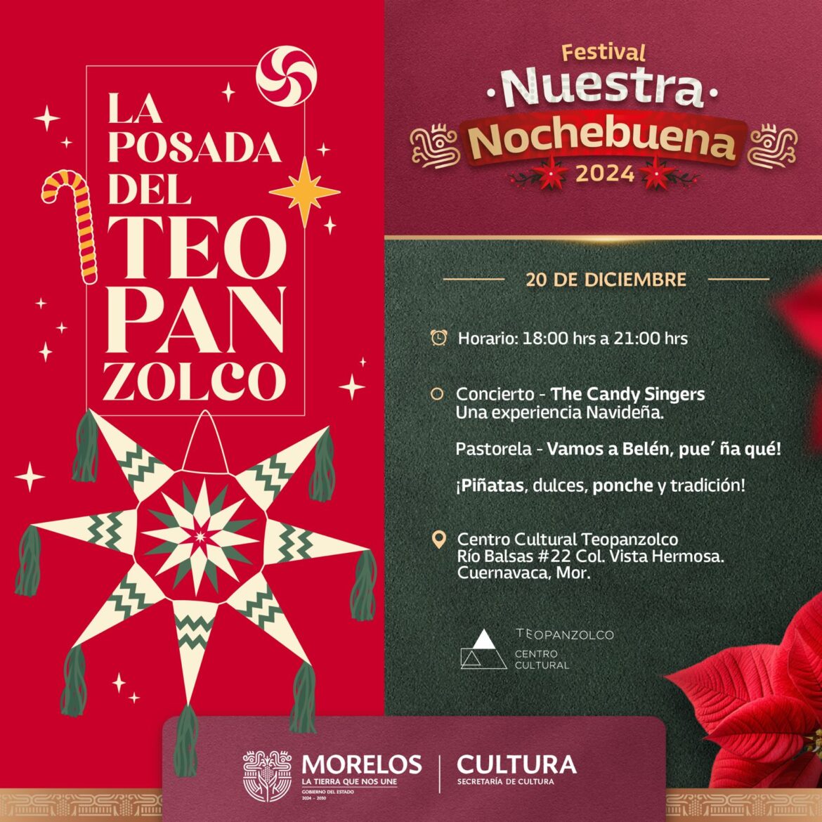 En el marco de las actividades del Festival Nuestra Nochebuena 2024, la Secretaría de Cultura a través del Centro Cultural Teopanzolco (CCT) hace una cordial invitación a las familias morelenses y ciudadanía en general a formar parte de su posada navideña este viernes 20 de diciembre de 18:00 a 21:00 horas.