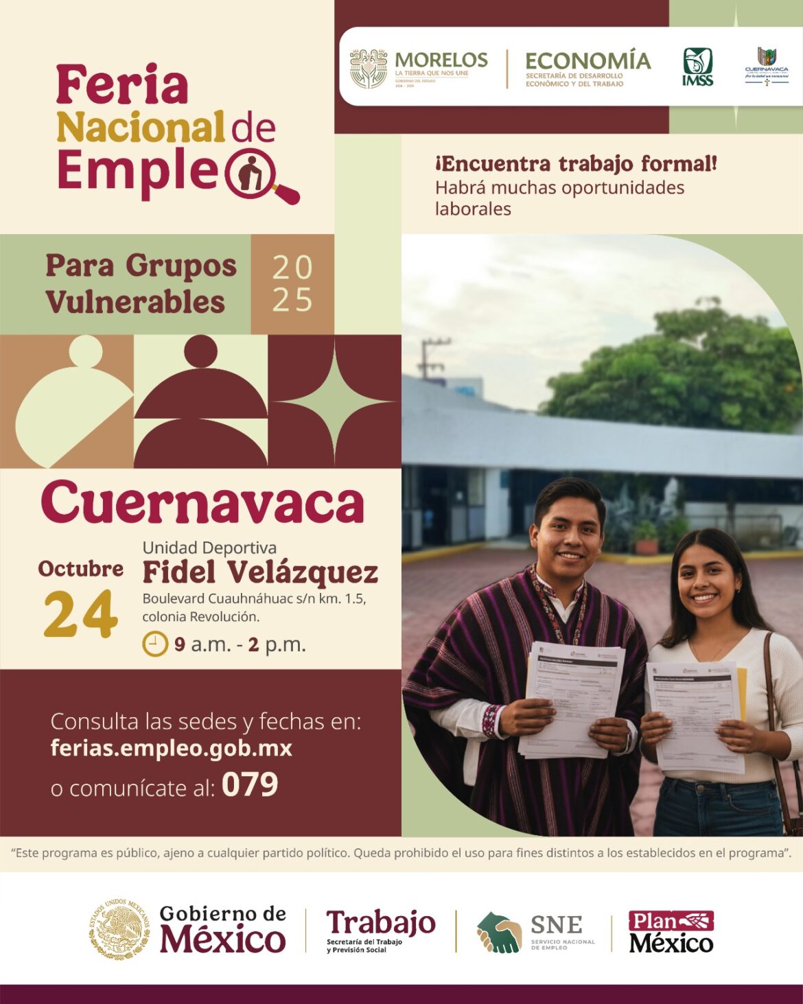 La Feria Nacional de Empleo Cuernavaca 2025 se llevará a cabo el viernes 24 de octubre, en la Unidad Deportiva Fidel Velázquez, ubicada en Boulevard Cuauhnáhuac s/n, km 1.5, colonia Revolución, en un horario de 9:00 a 14:00 horas, y las y los interesados podrán consultar próximas sedes y fechas en www.ferias.empleo.gob.mx