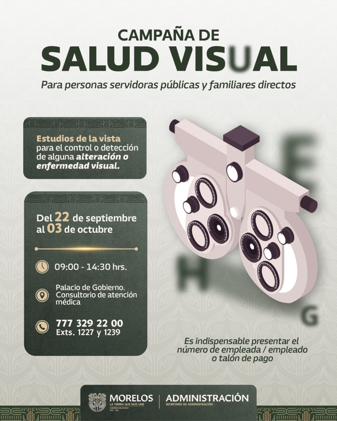 Para fomentar entornos laborales saludables y contribuir al bienestar del personal que labora en el Poder Ejecutivo, la Secretaría de Administración, a través de la Dirección General de Recursos Humanos, informa que se llevará a cabo la Campaña de Salud Visual.