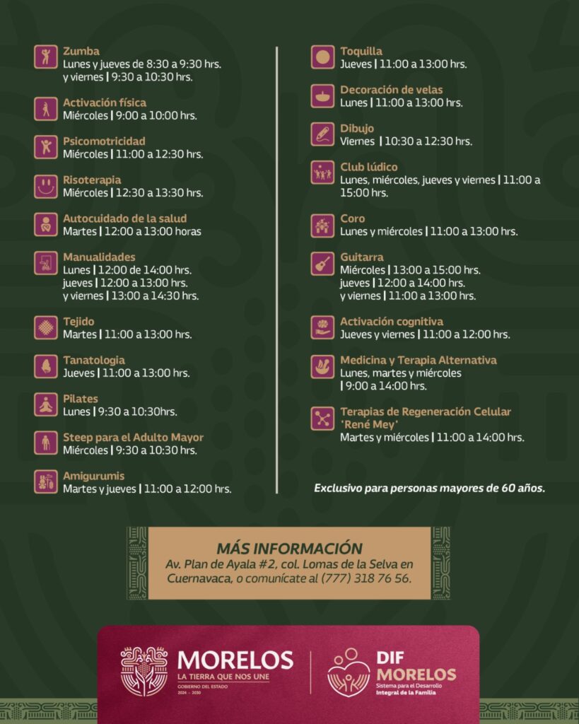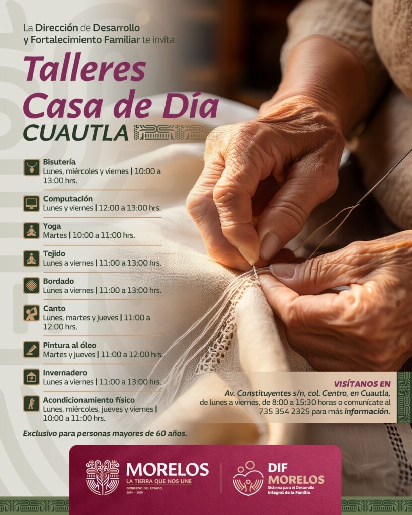 Por su parte, la Casa de Día Cuautla, ubicada en avenida Constituyentes, sin número del centro de Cuautla, se brindan talleres exclusivos para personas mayores de 60 años, como bisutería, computación, yoga, tejido, bordado, canto, pintura al óleo, invernadero y acondicionamiento físico, enfocados en el aprendizaje continuo y el bienestar integral.