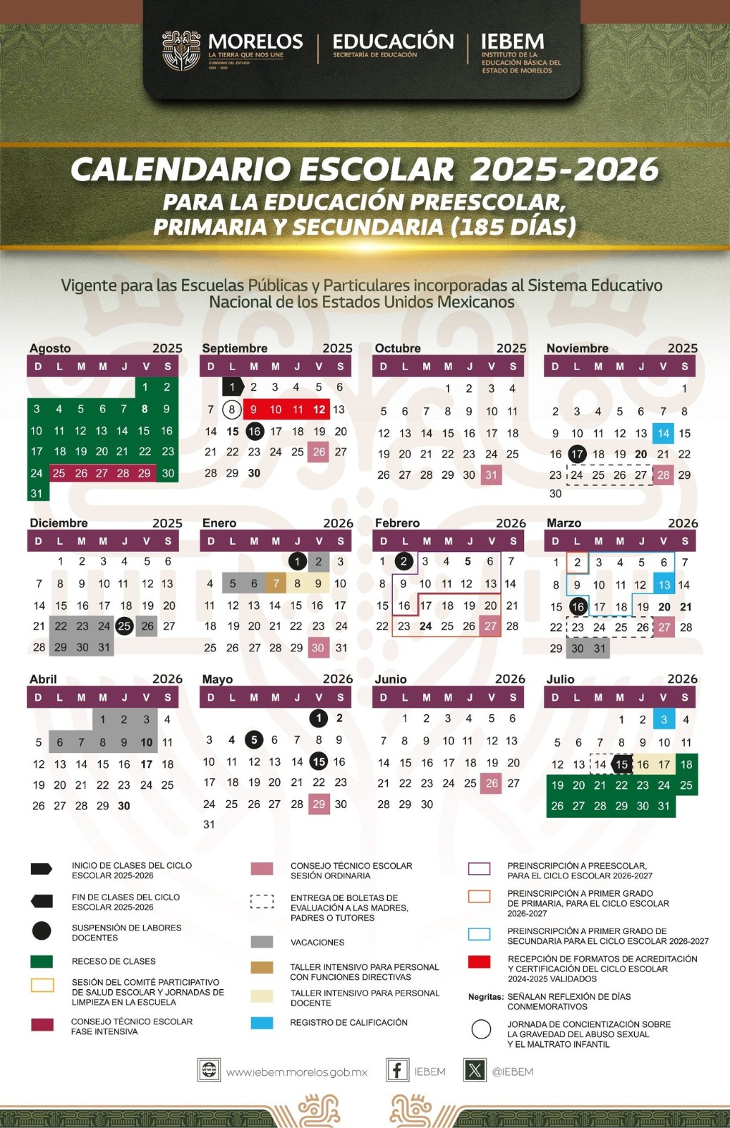 El director general del Instituto de la Educación Básica del Estado de Morelos (IEBEM), Leandro Vique Salazar, presentó el Calendario Escolar para el Ciclo Escolar 2025-2026, el cual consta de 185 días de clases aplicables en todas las escuelas de Preescolar, Primaria y Secundaria en el territorio morelense y de 190 días efectivos de actividades escolares para Educación Normal y la formación de las maestras y maestros.