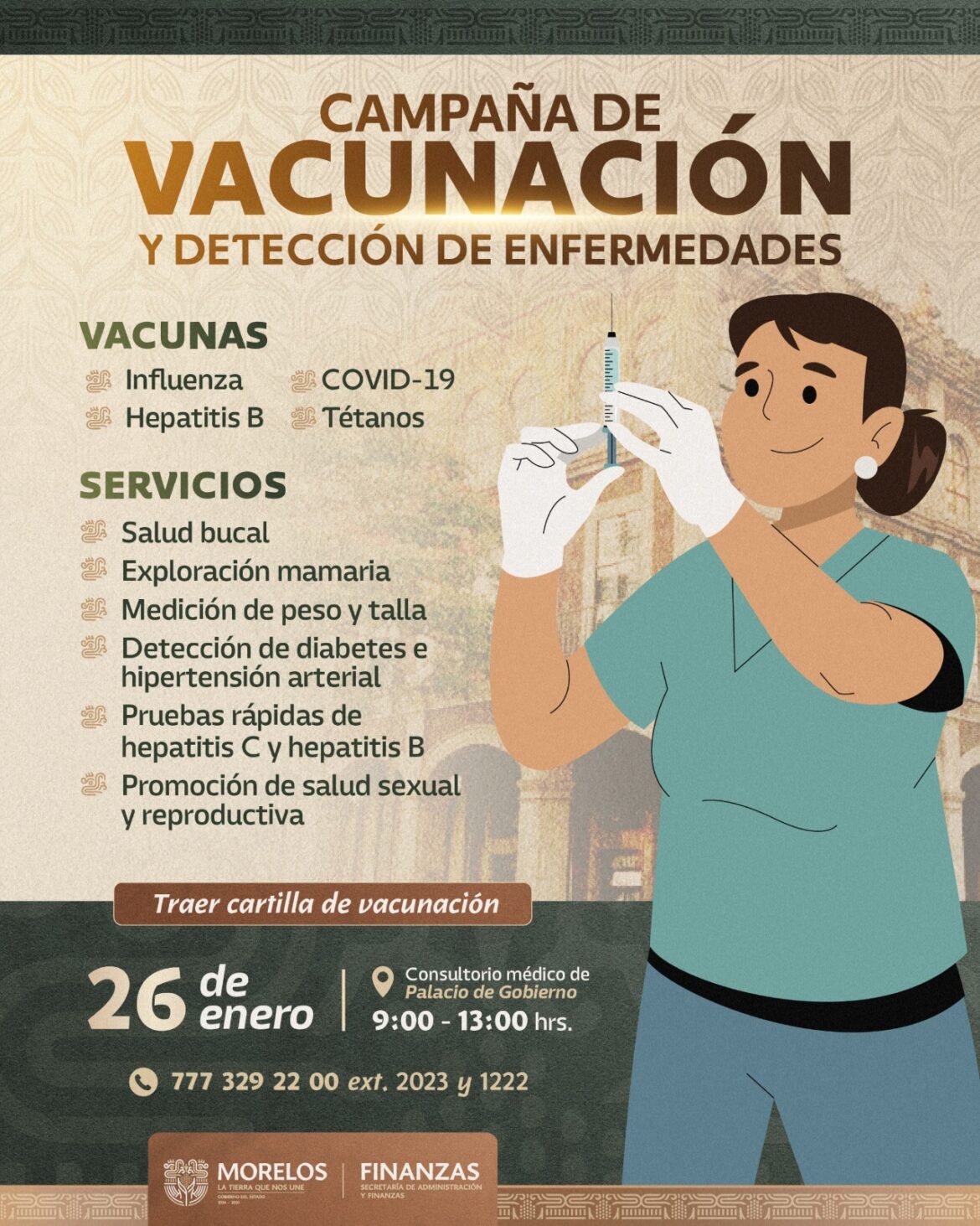 En el marco de la política de atención integral al personal del Gobierno de Morelos, el próximo 26 de enero la Secretaría de Administración y Finanzas, encabezada por Jorge Salazar Acosta, llevará a cabo una campaña de vacunación y detección de enfermedades dirigida a las y los servidores públicos.