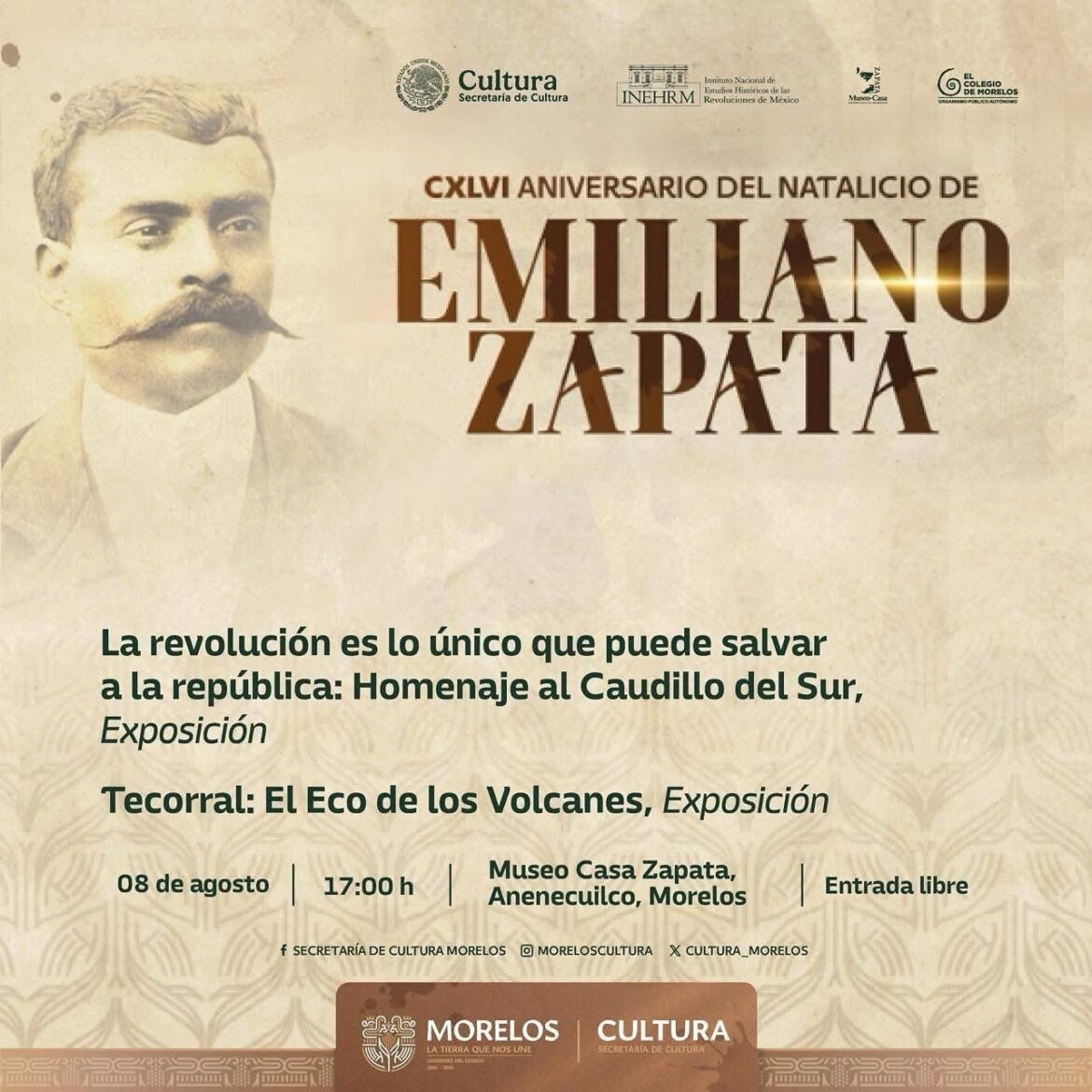 En el marco del CXLVI aniversario del natalicio del General Emiliano Zapata Salazar, el Gobierno de “La tierra que nos une”, a través de la Secretaría de Cultura, informó que se llevará a cabo la inauguración de las exposiciones “La Revolución es lo único que puede salvar a la república: Homenaje al Caudillo del Sur” y “Terrocal: El Eco de los volcanes”, que tendrá lugar el próximo 08 de agosto a las 17:00 horas en el Museo Casa Zapata, ubicado en Anenecuilco, la entrada será libre para todo público.
