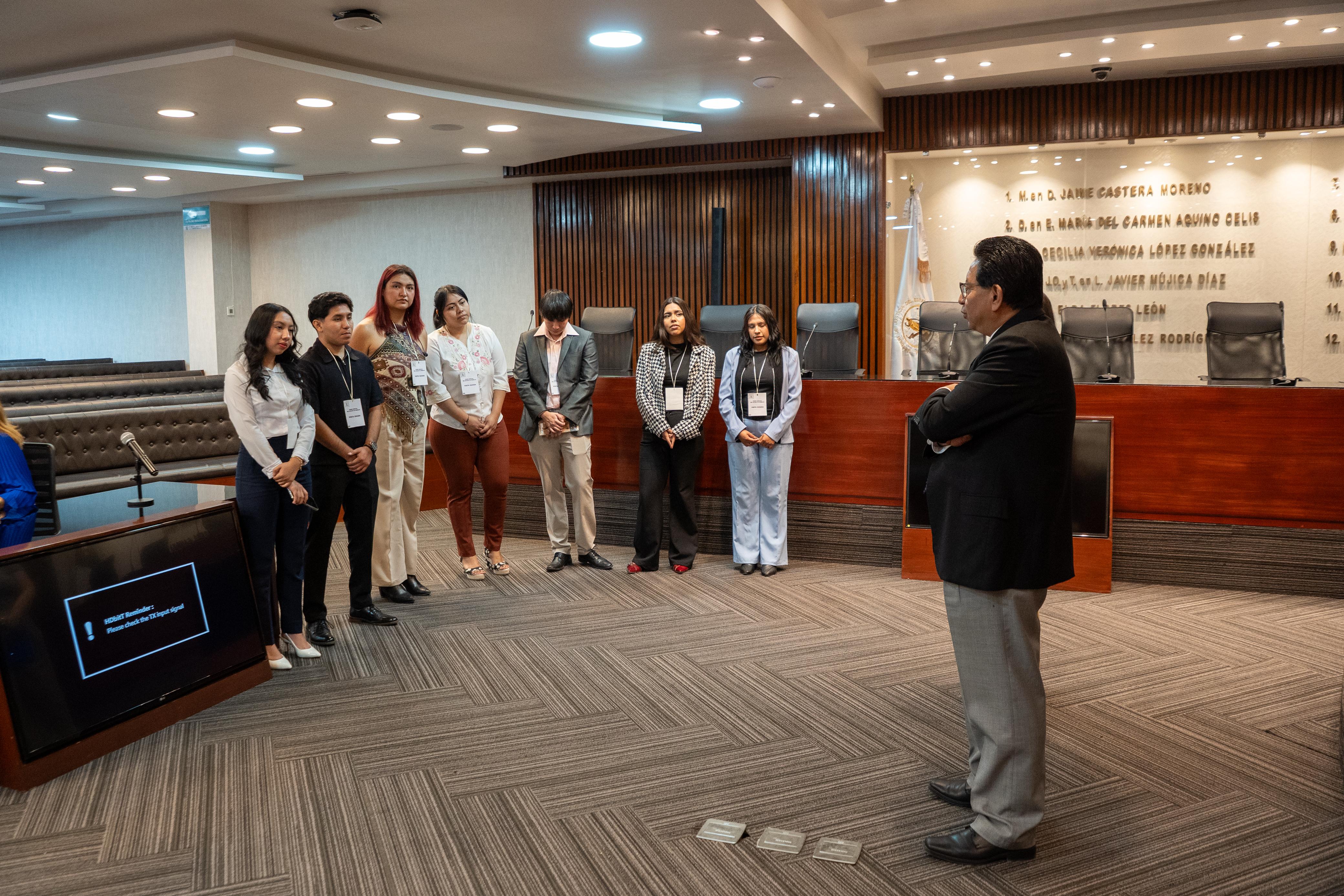 De manera adicional, tuvieron la oportunidad de ingresar al Salón de Plenos, donde dialogaron con el Magistrado Presidente del TSJEM, Juan Emilio Elizalde Figueroa y los magistrados Manuel Díaz Carbajal y Juan Gabriel Vargas Téllez, quienes destacaron la importancia de fortalecer la formación académica mediante el acercamiento directo a la práctica jurisdiccional.