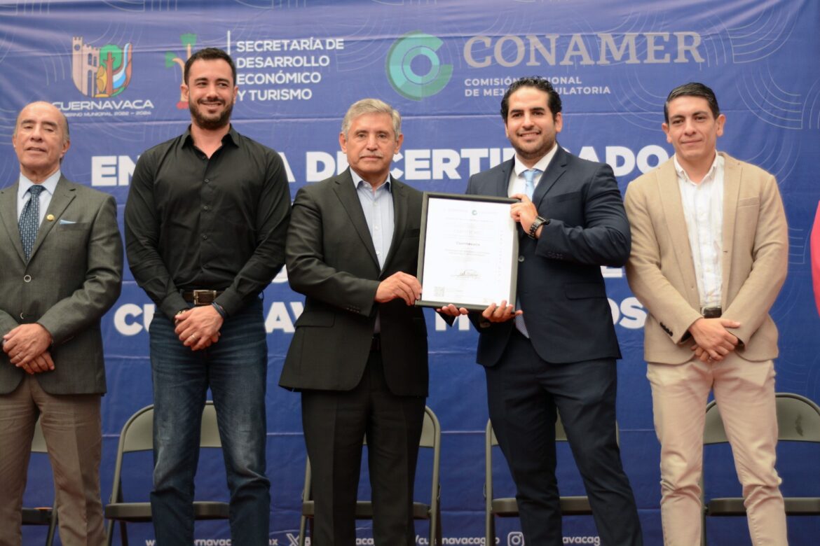 Ante integrantes del Cabildo y Gabinete, así como de autoridades estatales y federales, José Luis Urióstegui, puntualizó que este es el segundo certificado que reciben por parte de la CONAMER, demostrando que la administración municipal en Cuernavaca ha cumplido con la innovación, digitalización y disminución de trámites a favor de la población.