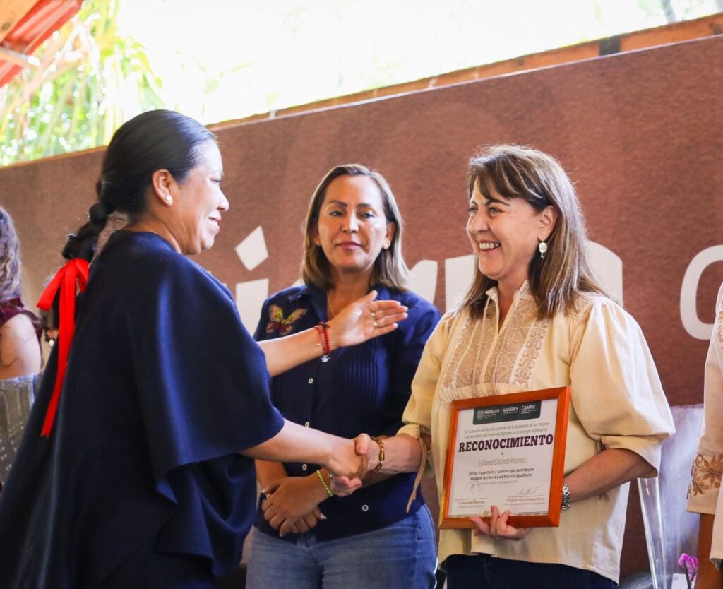 Durante el evento, la Gobernadora entregó reconocimientos a Jeanette Aguirre Avilés, Guadalupe Isabel Magallón Salinas, Liliana Chimal Ramos y Martha Janet Pizaña Castillo, por su trayectoria, aportaciones productivas y compromiso con el desarrollo rural.