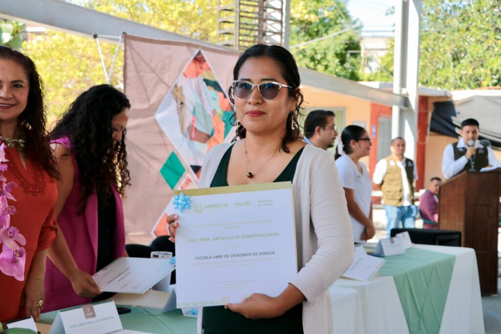 La Secretaría de Salud, a través de Servicios de Salud de Morelos (SSM), entregó placas de reconocimiento a 14 escuelas de los municipios de Jojutla, Tlaltizapán, Zacatepec, Tlaquiltenango, Xoxocotla, Puente de Ixtla y Amacuzac, por ser certificadas como espacios libres de criaderos del mosquito transmisor del dengue, zika y chikungunya.