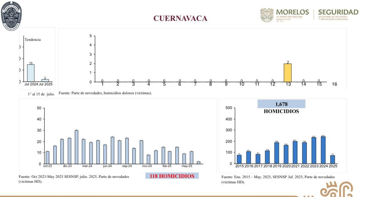 Durante la conferencia de prensa quincenal, el secretario de Seguridad y Protección Ciudadana, Miguel Ángel Urrutia Lozano, informó que de acuerdo a cifras de la Mesa de Coordinación Estatal para la Construcción de Paz y Seguridad, del 01 al 15 de julio de 2025 se registraron únicamente dos homicidios dolosos en Cuernavaca, en contraste con los 15 casos ocurridos en el mismo periodo del año anterior; lo que representa una cifra muy baja en más de una década y obedece a la coordinación entre los tres órdenes de Gobierno, el fortalecimiento de la inteligencia operativa y la participación ciudadana mediante las denuncias.