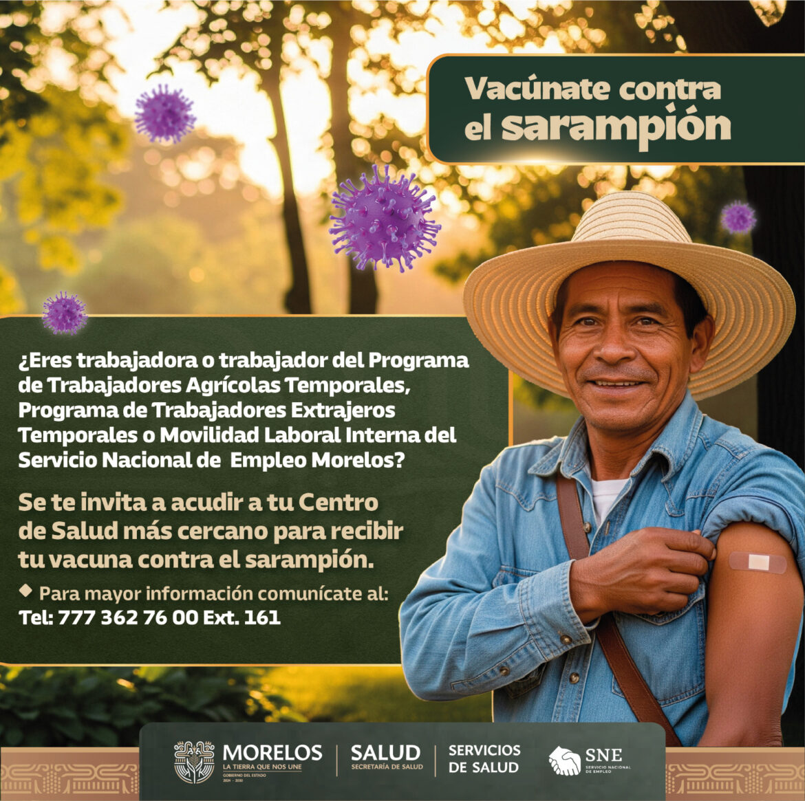 Con la finalidad de salvaguardar la salud de las y los trabajadores en movilidad, el Gobierno del Estado de Morelos, encabezado por Margarita González Saravia, fortaleció las acciones preventivas contra el sarampión mediante una estrategia coordinada entre las secretarías de Salud y de Desarrollo Económico y del Trabajo, Servicios de Salud de Morelos (SSM) y el Servicio Nacional de Empleo (SNE) Morelos.