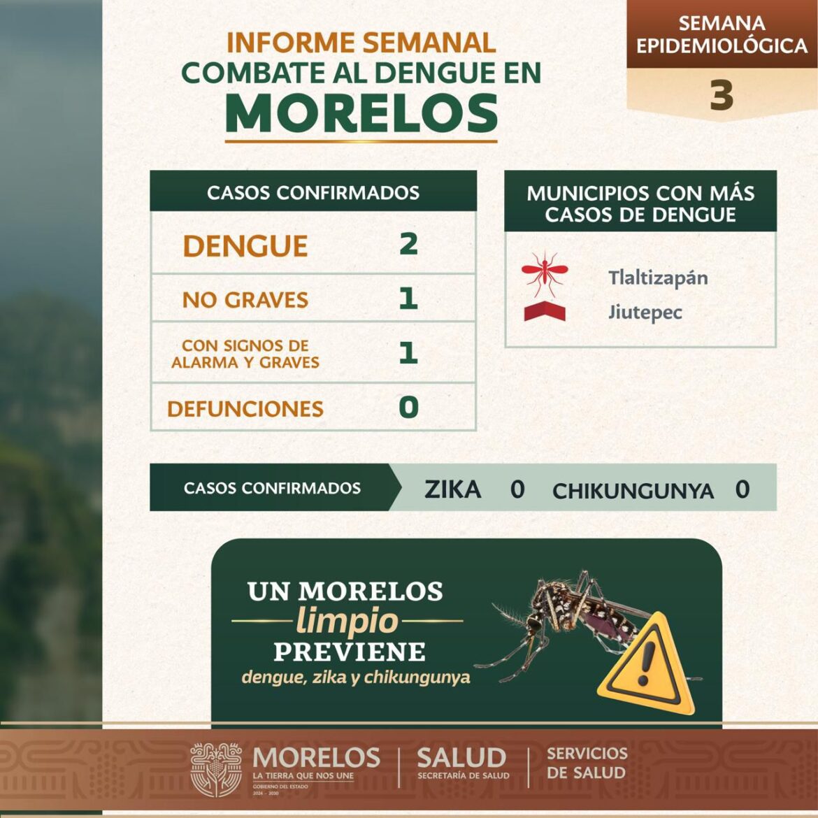 Precisó que, durante la semana epidemiológica número tres, Morelos ha reportado dos casos confirmados de dengue en los municipios de Tlaltizapán y Jiutepec. Ante este panorama, el Departamento de Dengue mantiene de manera permanente acciones de prevención, control y monitoreo del mosquito Aedes aegypti en la entidad, priorizando la instalación y revisión de ovitrampas en localidades estratégicas.