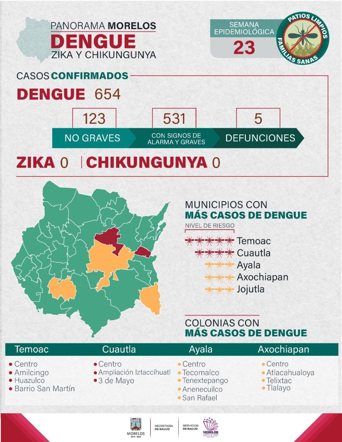 A la semana epidemiológica 23, se han registrado 654 casos acumulados de dengue, de los cuales 123 están clasificados como no graves y 531 con signos de alarma y graves, así como, cinco lamentables defunciones; hasta el momento, no se tienen registrados casos de zika y chikungunya.