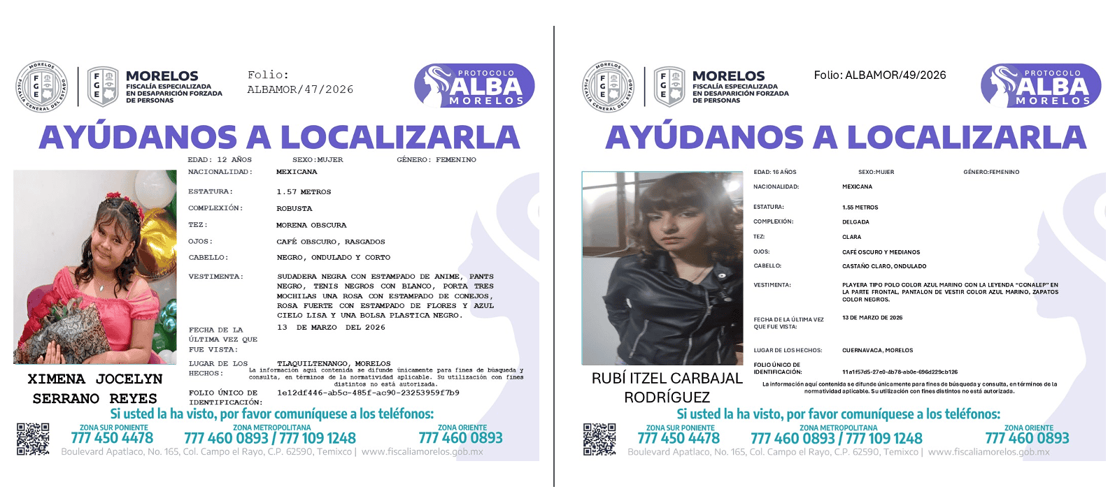 La Fiscalía General del Estado (FGE) ha activado de manera urgente los protocolos de búsqueda para localizar a dos jovencitas desaparecidas en las últimas horas: Rubí Itzel Carbajal Rodríguez y la pequeña Ximena Jocelyn Serrano Reyes. Estos casos se suman a la búsqueda vigente de Ayelen Iglesias Vidal, estudiante del Colegio de Bachilleres,
