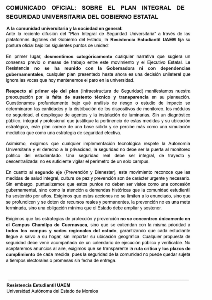Aunque el Gobierno del Estado presentó oficialmente el «Plan Integral de Seguridad Universitaria», que busca blindar los espacios académicos mediante el fortalecimiento de la infraestructura y programas de prevención, la Resistencia Estudiantil UAEM ha respondido con un rechazo contundente a la narrativa oficial, bajo la indicación de que no existe un consenso previo. Mientras las autoridades presentan el plan como una solución concertada, el movimiento estudiantil asegura que se trata de una decisión unilateral tomada sin consultar a las bases que mantienen el paro actualmente.