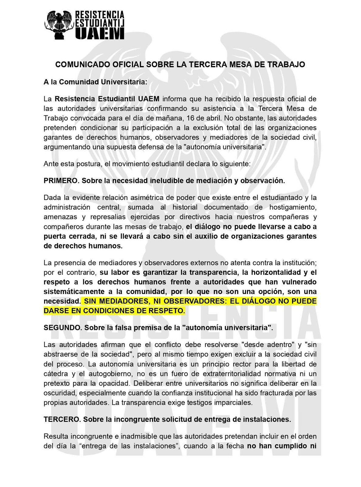 RESISTENCIA ESTUDIANTIL UAEM RATIFICA CONDICIONES PARA LA TERCERA MESA DE TRABAJO: SIN MEDIADORES NI OBSERVADORES, NO HAY DIÁLOGO