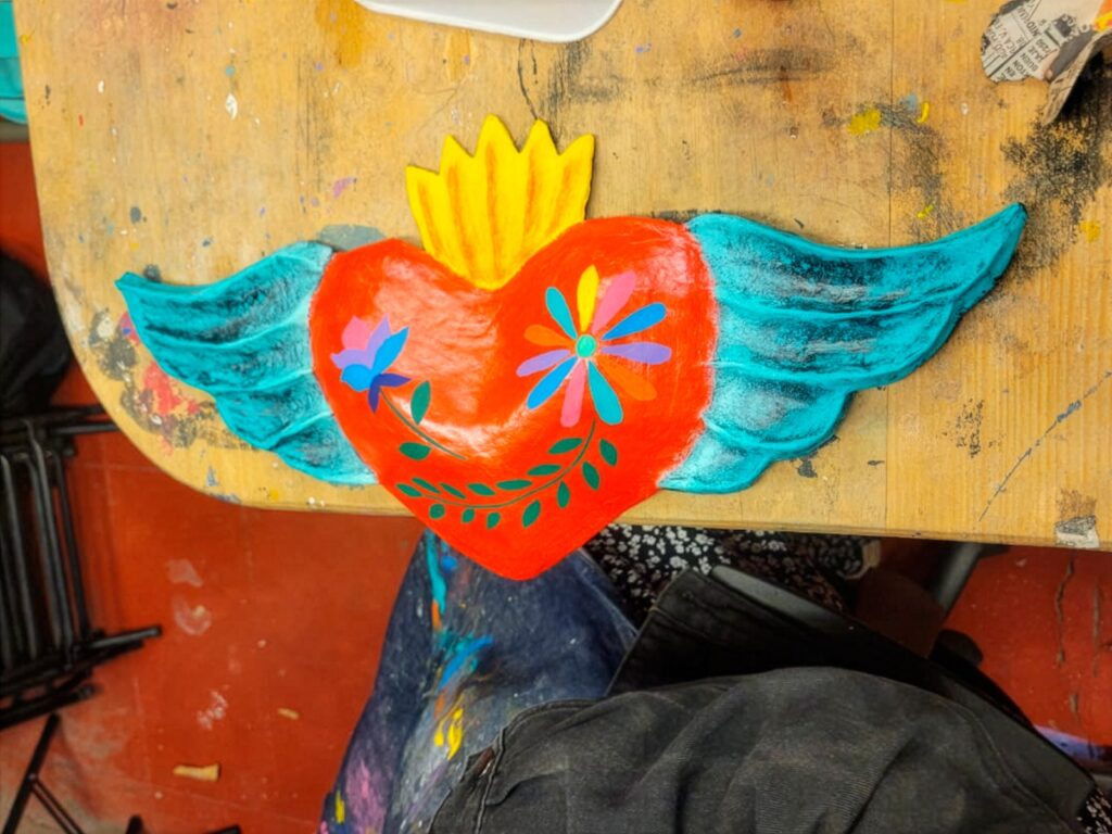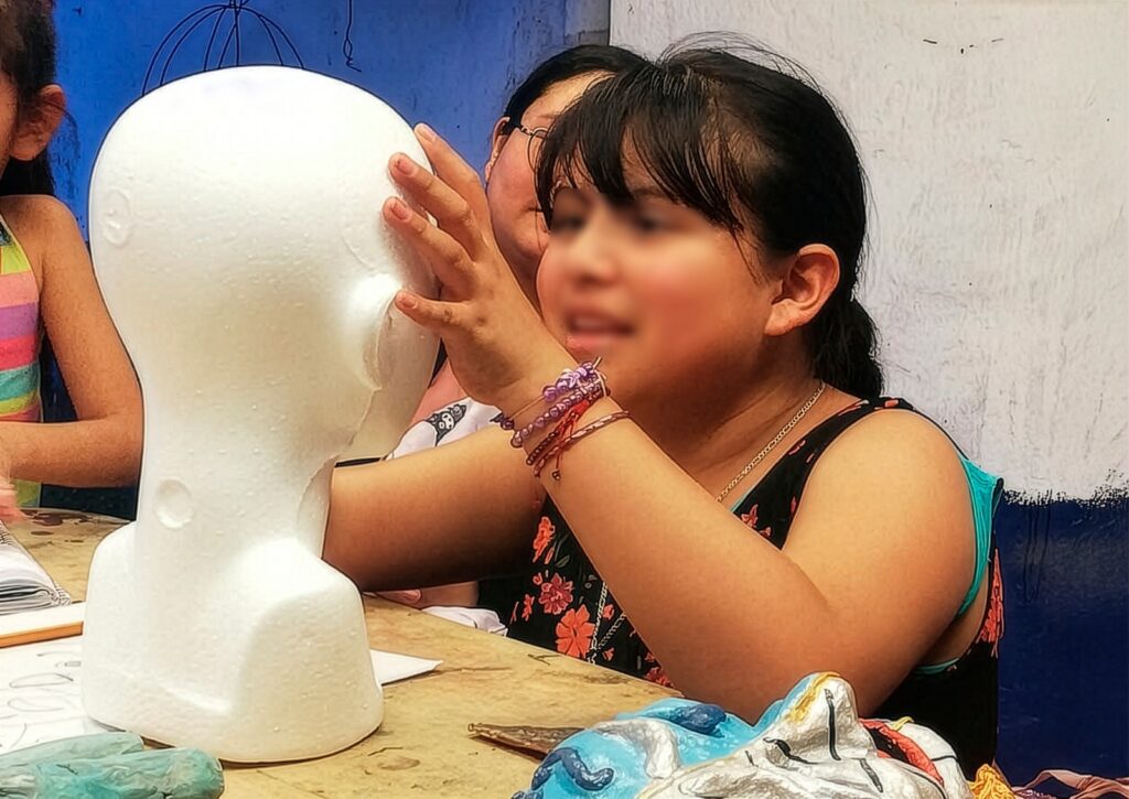 A lo largo del proceso formativo, las y los participantes se formaron en el modelado de máscaras de chinelo y calavera, así como en el trabajo de alambre para la elaboración de alebrijes, integrando técnicas de empapelado, definición de rasgos y pintado.