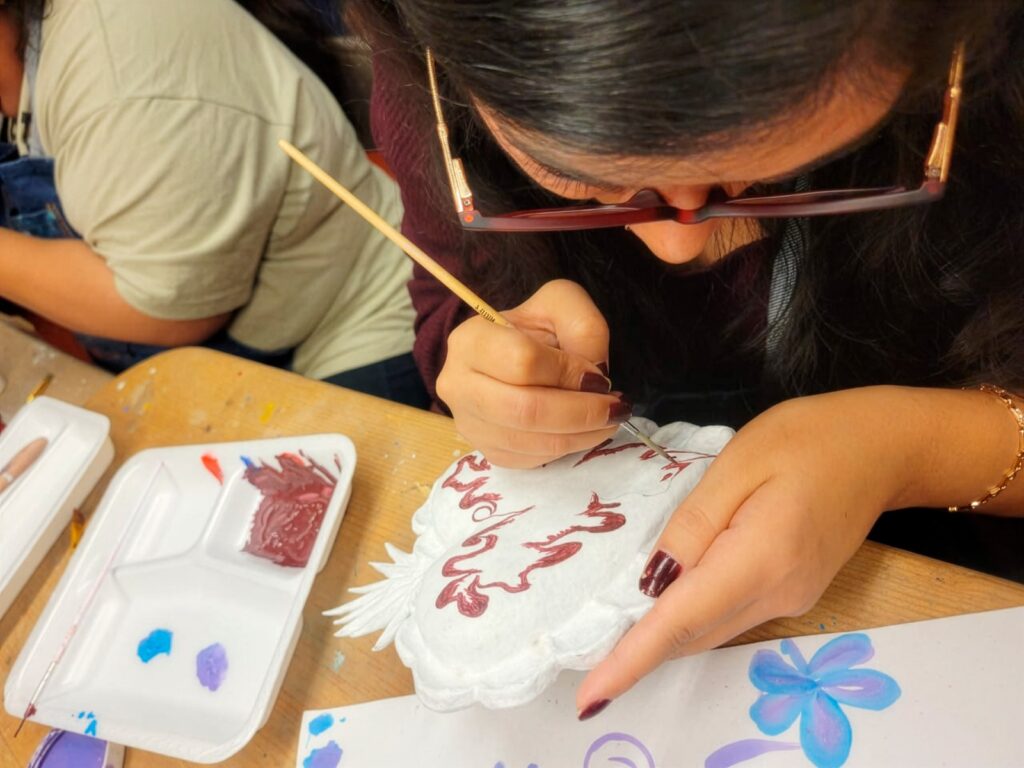 Asimismo, se abordó la preparación de engrudo tradicional, el detallado estético con papel y la aplicación de técnicas pictóricas como el difuminado, las mezclas de color y el rallado característico de la cartonería.