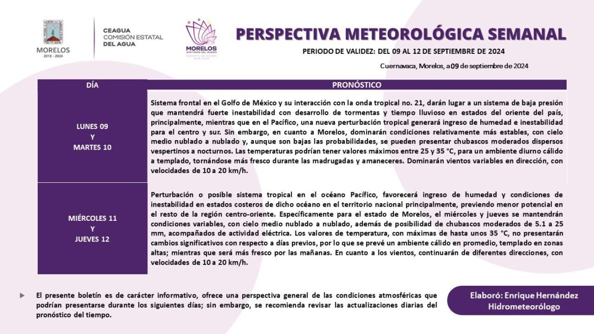 Específicamente para el estado de Morelos, el miércoles y jueves se mantendrán condiciones variables, con cielo medio nublado a nublado, además de posibilidad de chubascos moderados de 5.1 a 25 mm, acompañados de actividad eléctrica.