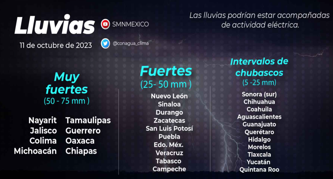 Hoy, se esperan lluvias muy fuertes (de 50 a 75 milímetros [mm]) en Colima, Chiapas, Guerrero, Jalisco, Michoacán, Nayarit, Nuevo León, Oaxaca, Sinaloa, Tamaulipas y Zacatecas; fuertes (de 25 a 50 mm) en Coahuila, Durango, Estado de México San Luis Potosí y Veracruz; intervalos de chubascos (de 5 a 25 mm) en Aguascalientes, Campeche, Chihuahua, Ciudad de México, Guanajuato, Hidalgo, Morelos, Puebla, Querétaro, Quintana Roo, Sonora, Tabasco, Tlaxcala y Yucatán, y aisladas (de 0.1 a 5 mm) en Baja California Sur.