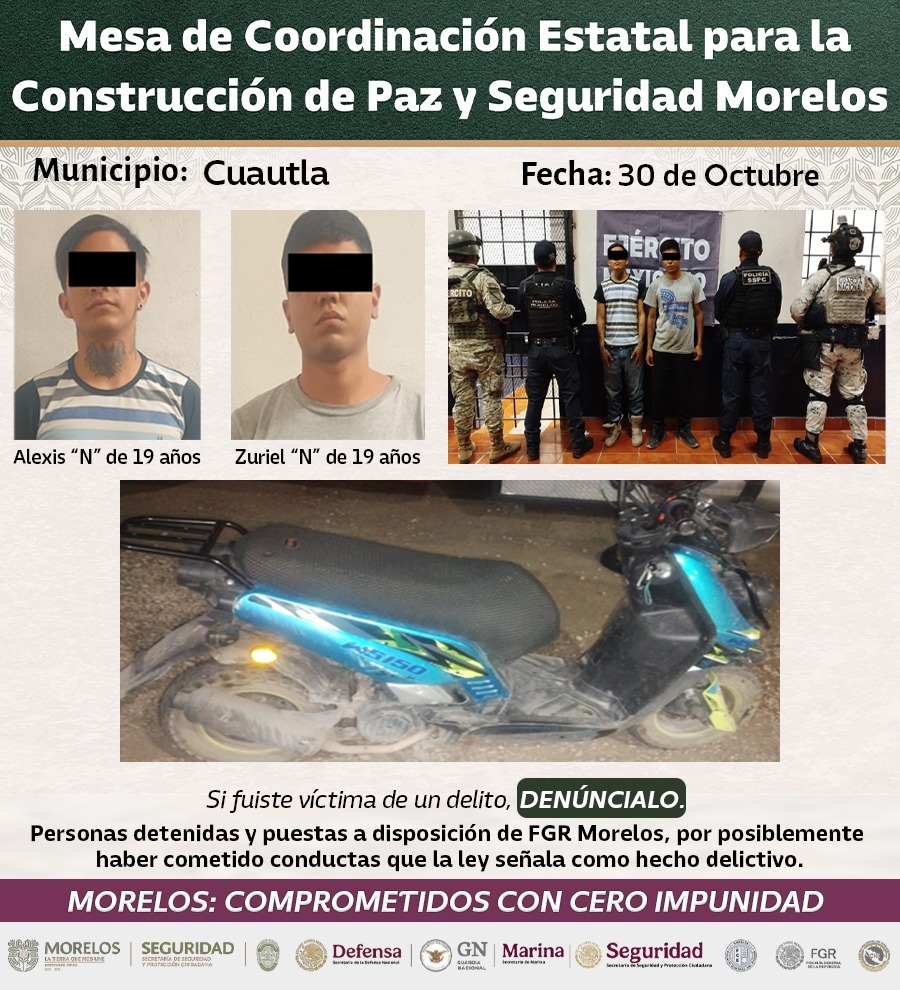 En otro acto se atendió un reporte de dos masculinos que se encontraban extorsionando a empleados de un vivero del municipio de Cuautla, por lo fueron detenidos Alexis “N” de 19 años y Zuriel “N” de 19 años, derivado de ello se realizaron actos de investigación, estableciendo su vinculación con un estimado de ocho denuncias por el delito de extorsión a cargo del grupo delictivo autodenominado “Cártel del Pacífico” del líder delictivo Júpiter “N”, alias “Barbas”, quien ahora se hace llamar “La Empresa”.
