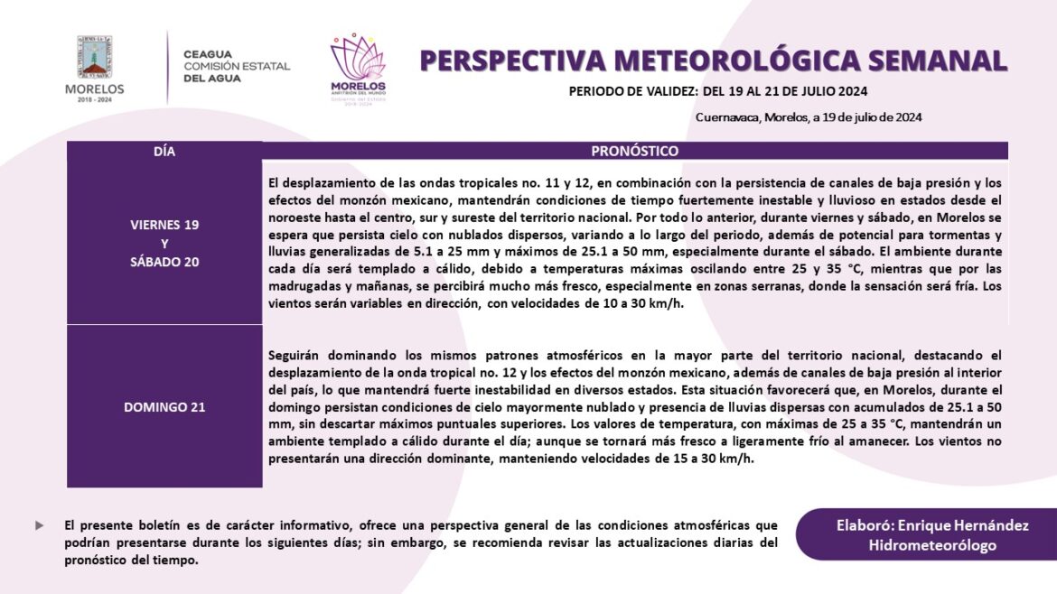 La Comisión Estatal del Agua (Ceagua) emite la perspectiva meteorológica referente al periodo del 19 al 21 de julio, en la que se pronostican condiciones de cielo medio nublado a nublado, manteniendo potencial para la ocurrencia de lluvias generalizadas. El ambiente se mantendrá templado a cálido durante el día.