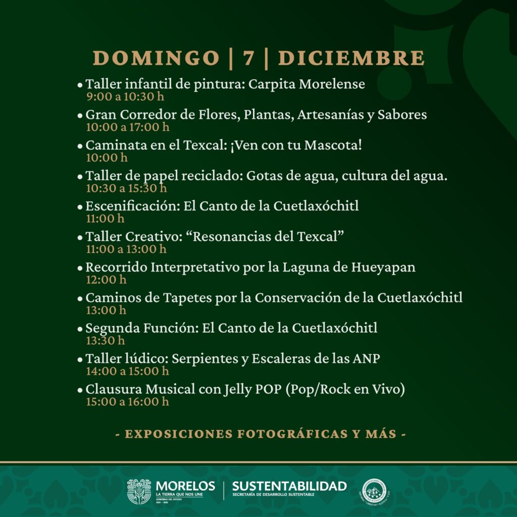 A partir de las 14:00 horas, el público podrá disfrutar de Sabores de Tejalpa, una muestra gastronómica con Cuetlaxóchitl. El Taller de Cartonería dará inicio a las 14:50 horas, y posteriormente se presentará la Serie de Tapetes “Cuetlaxóchitl y la Biodiversidad del Texcal”. A las 15:30 horas, el Grupo Folklórico Kukulcán ofrecerá una presentación especial.