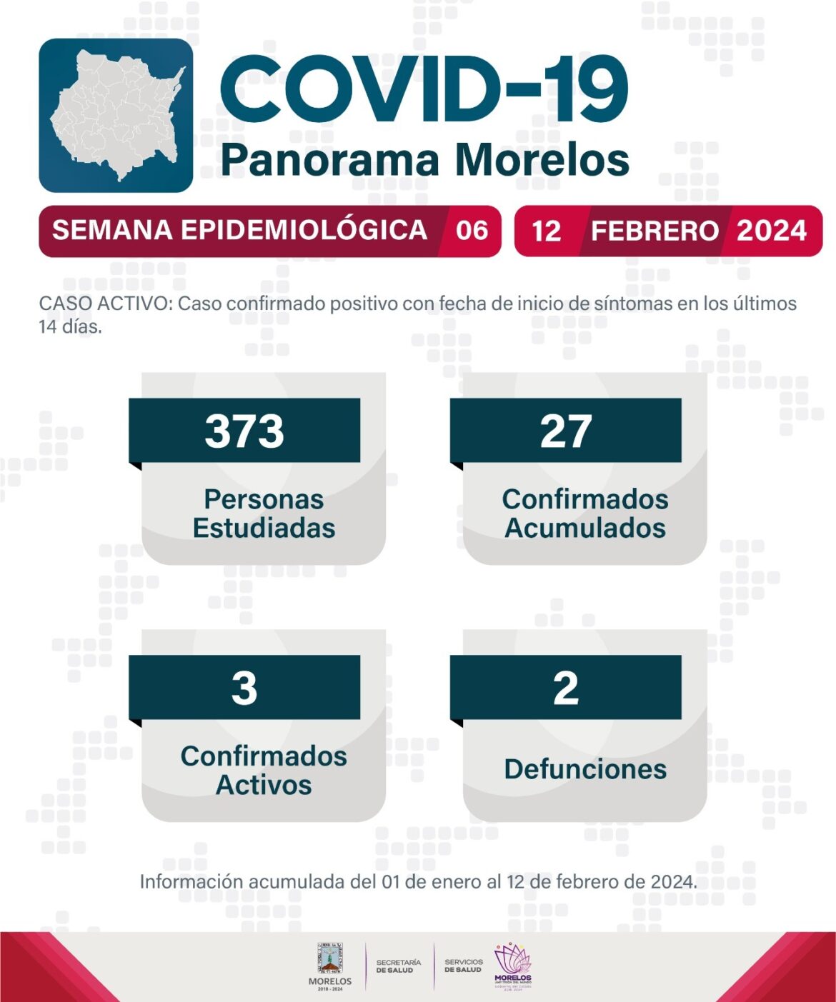 La Secretaría de Salud informó que, al corte de la semana epidemiológica 06, Morelos reporta 373 personas estudiadas de manera acumulada; 27 casos positivos de COVID-19; 3 casos activos y 2 defunciones.