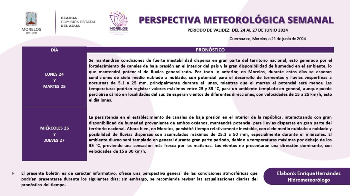 La Comisión Estatal del Agua (Ceagua) informa sobre el pronóstico del tiempo para el periodo del 24 al 27 de junio de este año, en el que prevalecerán condiciones relativamente inestables, con cielo medio nublado a nublado y posibilidad de lluvias dispersas. El ambiente templado a cálido dominará durante el día.