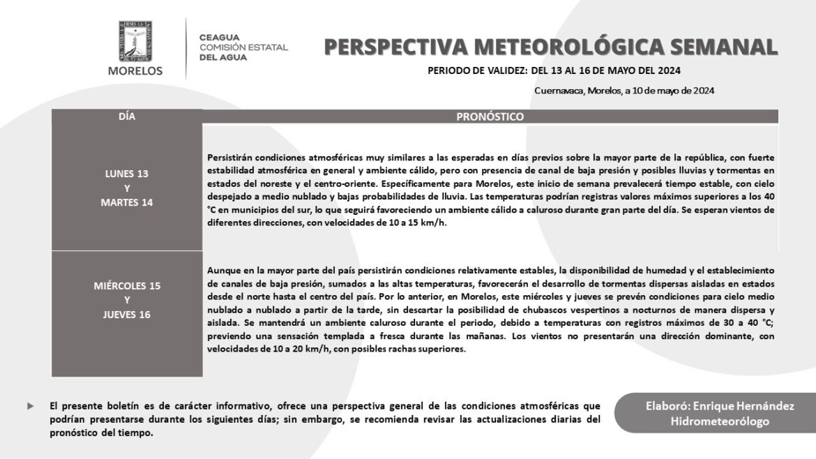 La Comisión Estatal del Agua (Ceagua) emite la perspectiva meteorológica referente a las condiciones para el período del 13 al 16 de mayo, en el que se prevé ambiente cálido a muy caluroso durante el día, además de cielo despejado a medio nublado, y bajas probabilidades para la ocurrencia de lluvias.