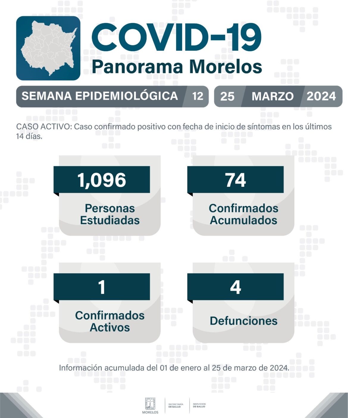 La Secretaría de Salud informó que, al corte de la semana epidemiológica 12, Morelos reporta 1,096 personas estudiadas de manera acumulada; 74 casos positivos de COVID-19; 1 caso activo y 4 defunciones.