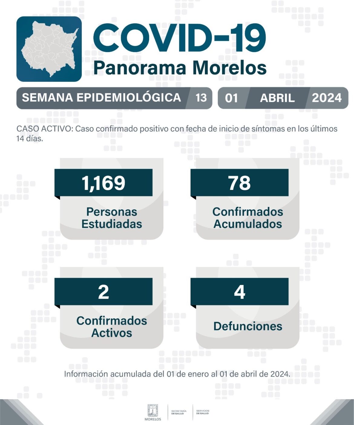 La Secretaría de Salud informó que, al corte de la semana epidemiológica 13, Morelos reporta 1,169 personas estudiadas de manera acumulada; 78 casos positivos de COVID-19; 2 casos activos y 4 defunciones.