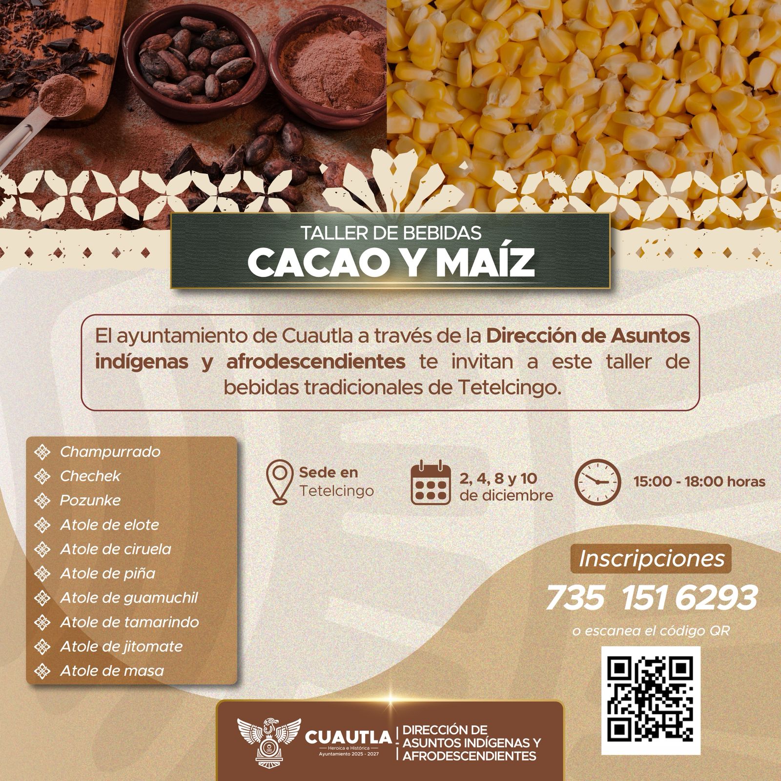 El Ayuntamiento de Cuautla, que preside el alcalde Jesús Corona Damián, a través de la Dirección de Asuntos Indígenas y Afrodescendientes, a cargo de la Lic. Gisela Casasanero, hace una cordial invitación a toda la ciudadanía a participar en el Taller de Cacao y Maíz: Bebidas Tradicionales de Tetelcingo.