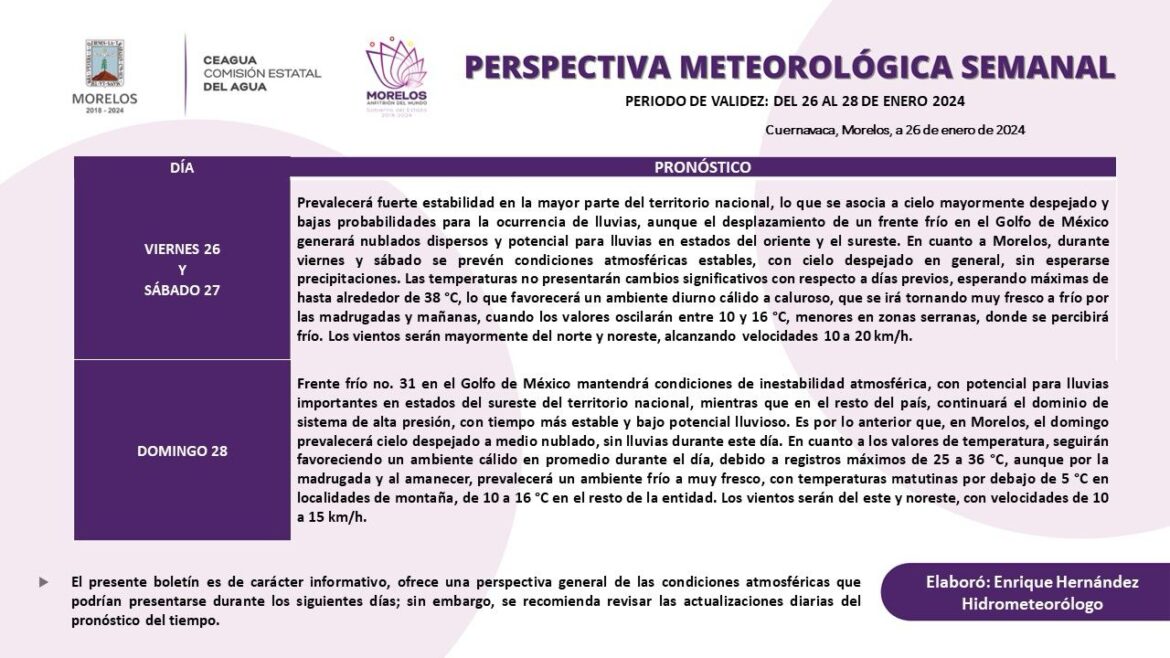 La Comisión Estatal del Agua (Ceagua) informa sobre el pronóstico del tiempo para este fin de semana en Morelos, en el que prevalecerá cielo mayormente despejado, sin esperarse lluvias. El ambiente será cálido a caluroso durante el día, cambiando a una sensación muy fresca a fría al amanecer.