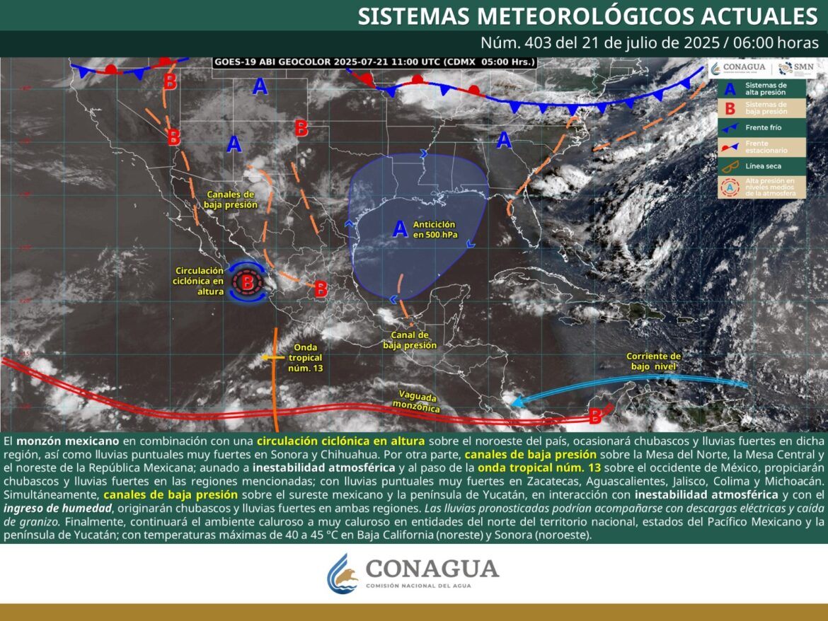 La Comisión Estatal del Agua (Ceagua) da a conocer la perspectiva meteorológica para Morelos durante la semana del 21 al 24 de julio, en donde predominará una semana con cielo medio despejado, ambiente caluroso por las tardes y presencia de lluvias ligeras a chubascos acompañados de actividad eléctrica. Las precipitaciones se concentrarán principalmente en el norte del estado y la zona metropolitana de Cuernavaca, especialmente entre martes y jueves.