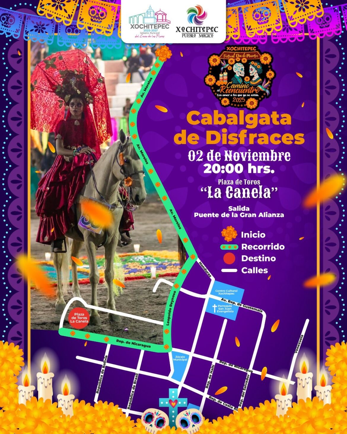 Una de las actividades más esperadas del “Festival de Día de Muertos Xochitepec 2025 – Camino al Reencuentro con Amor a los que ya no están” es la cabalgata y concurso de disfraces, donde jinete y caballo se visten con atuendos alusivos a la tradición mexicana, proyectando respeto y homenaje a quienes viven en la memoria y corazón.