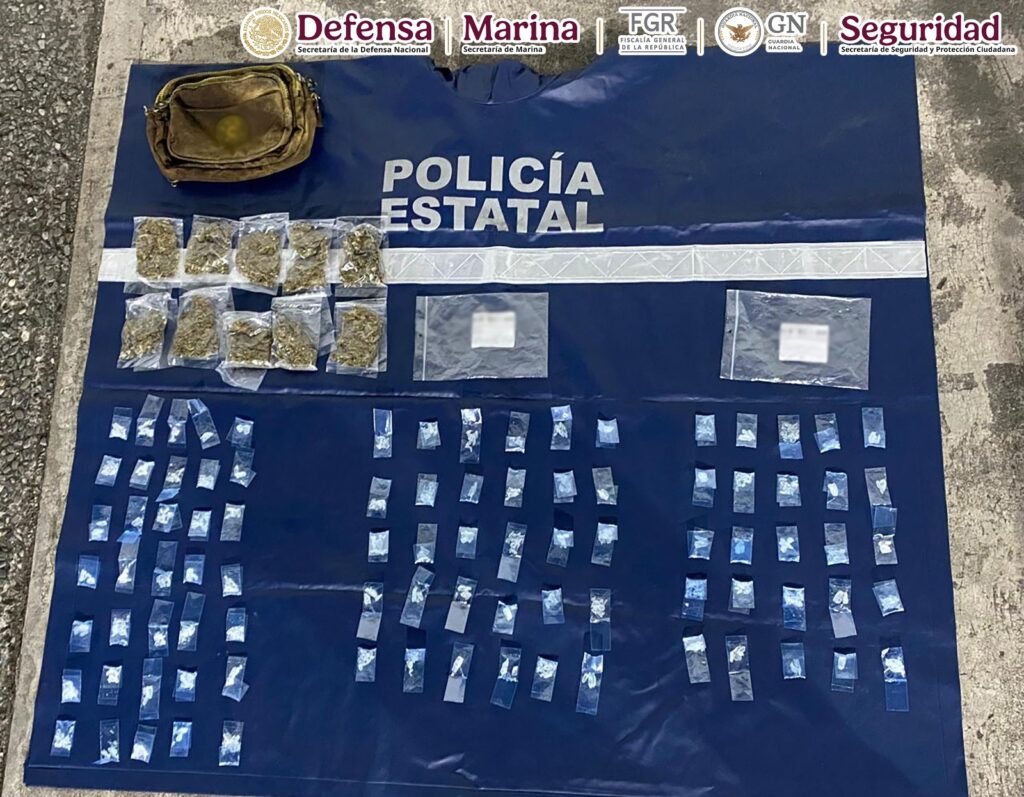 En tanto, de manera coordinada con autoridades estatales y municipales se realizó un despliegue operativo para ubicar y detener a los demás involucrados, fue así que mediante el análisis de las cámaras de monitoreo se ubicó y dio alcance en la autopista del Sol, a la altura de la caseta Paso-Morelos a una camioneta de color azul donde viajaban tres hombres, a los cuales se les marcó el alto y se les realizó una revisión de seguridad, donde les hallaron 90 dosis de cristal y 10 de marihuana.