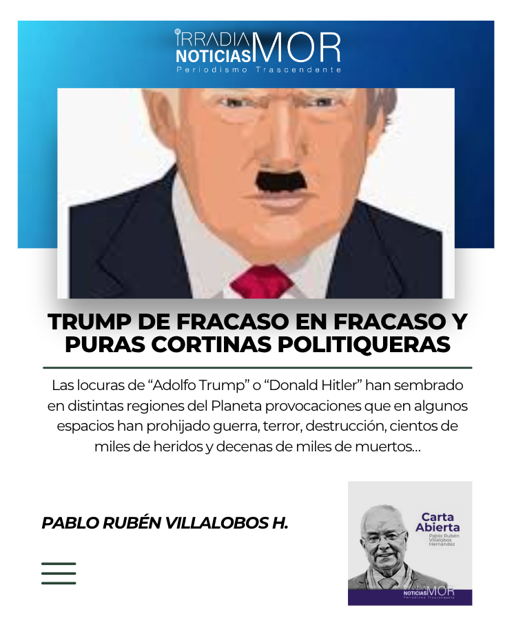 Las locuras de “Adolfo Trump” o “Donald Hitler” han sembrado en distintas regiones del Planeta provocaciones que en algunos espacios han prohijado guerra, terror, destrucción, cientos de miles de heridos y decenas de miles de muertos… Sólo como una referencia ahí están los crímenes de Lesa Humanidad en la Franja de Gaza en presunta o real alianza con Benjamín Netanyahu el israelí para dar y recibir bombardeos donde las manos de los sirios y palestinos también “mecen la cuna”… Por si eso fuera poco, el total apoyo dado en principio al ucraniano Volodimir Selensky en el marco de la desigual e inhumana guerra de Ucrania contra Rusia, ha tenido también de ida y vuelta guerra, destrucción, heridos y muertos en cantidades incuantificables de uno y de otro lado, a grado tal que los madruguetes de Selensky contra Rusia en la plataforma militar aérea de Belaya por los rumbos de Siberia, ha tenido en secuencia los desquites ‘Putinianos’ en distintos lugares de Ucrania que sean estratégicos o no han dejado destrucción en áreas urbanas y como consecuencia muertos al por mayor… Esas tarugadas a lo Trump se vivieron en otros espacios y tal vez se mantengan por las torpezas del mandatario estadounidense quien se quiere apoderar a como de lugar del territorio de Groenlandia que pertenece a Dinamarca; la idiotez de pretender cambiarle de nombre al Golfo de México que en ninguna parte del mundo ha sido apoyada; la estúpida ambición de querer convertir a Canadá en el Estado número 51 de la Unión Americana frente a lo cual el anterior primer ministro Justin Trudeau y el actual Mark Carney le leyeron la carilla al ‘Trumpiano’ para cerrarle totalmente las puertas a esa descabellada intención… Más ocurrencias a lo tarugo las ha tenido con sus presuntos aranceles impositivos que en sube y baja afectan más a la economía de los Estados Unidos que a los países a los que se les pretende aplicar y frente a ello, la Unión Europea ‘lo mandó a la China’ y éste País lo ‘rechinó’ con la respuesta de un arancel hasta del 35% a los productos del tal Donald… Peor aún le ha ido con lo que ha pasado al interior de la Unión Americana por la cuestión de los migrantes, que es la cortina politiquera mayor qua ha aplicado para desgracia no sólo de los migrantes sino de los estadounidenses de diversas ciudades, principalmente las llamadas ‘Santuario’ que han visto asediadas por las fuerzas militares, militarizadas y policiacas del supra gobierno de los Estados Unidos contra su propio territorio y habitantes, pues el ignaro Presidente de ese País se lanzó a lo ‘tontejo’ contra sus espacios y los suyos por un lado, para tapar sus ocurrencias fallidas en el exterior de ese país que ya hemos mencionado y por el otro, para desquitar sus ansias hitlerianas xenofóbicas tomando como víctimas a los jodidos migrantes que ilegales o no se encuentren en los Estados Unidos… Perversamente, las ciudades seleccionadas por Trump por ser considerados espacios para la protección de los migrantes, son territorios locales políticos en Poder del Parido Demócrata que en forma ya no tan anticipada, es la presa apetecida del ‘Trumpiano’por las cercanas elecciones intermedias en los Estados Unidos… Ciudades como Los Ángeles, Chicago, Nueva York, Atlanta, San Francisco, Washington, Filadelfia entre otras son gobernadas por demócratas y en efecto, permiten el tránsito de los migrantes pero no gratuitamente, sino por lo que ellos significan en la prestación de servicios, en el cumplimiento de trabajos pesados, en actividades como labriegos del campo entre otras más que los estadounidenses blancos no aguantan y necesitan de la resistencia de los chinos, coreanos, indues, africanos, caribeños, latinoamericanos y de otras regiones del mundo… Estos que victimiza Donald Trump son un gran sostén económico de su País, por lo cual los ciudadanos estadounidenses ya claman, reclaman, se manifiestan y pronuncian contra el tal Donald por sus aberraciones y equivocaciones como esa de perseguir a los campesinos en sus campos de cultivo, orden dada y por la cual reculó el tal Trump… Como se ve, las torpezas en el exterior las trató de cubrir con la serie de órdenes idiotas ejercidas al interior de su País… ¡Ya párenlo señores de las Cámaras de representantes, senadores y jueces que lo tienen en sus tribunales! ¡Hasta mañana que será un día más!