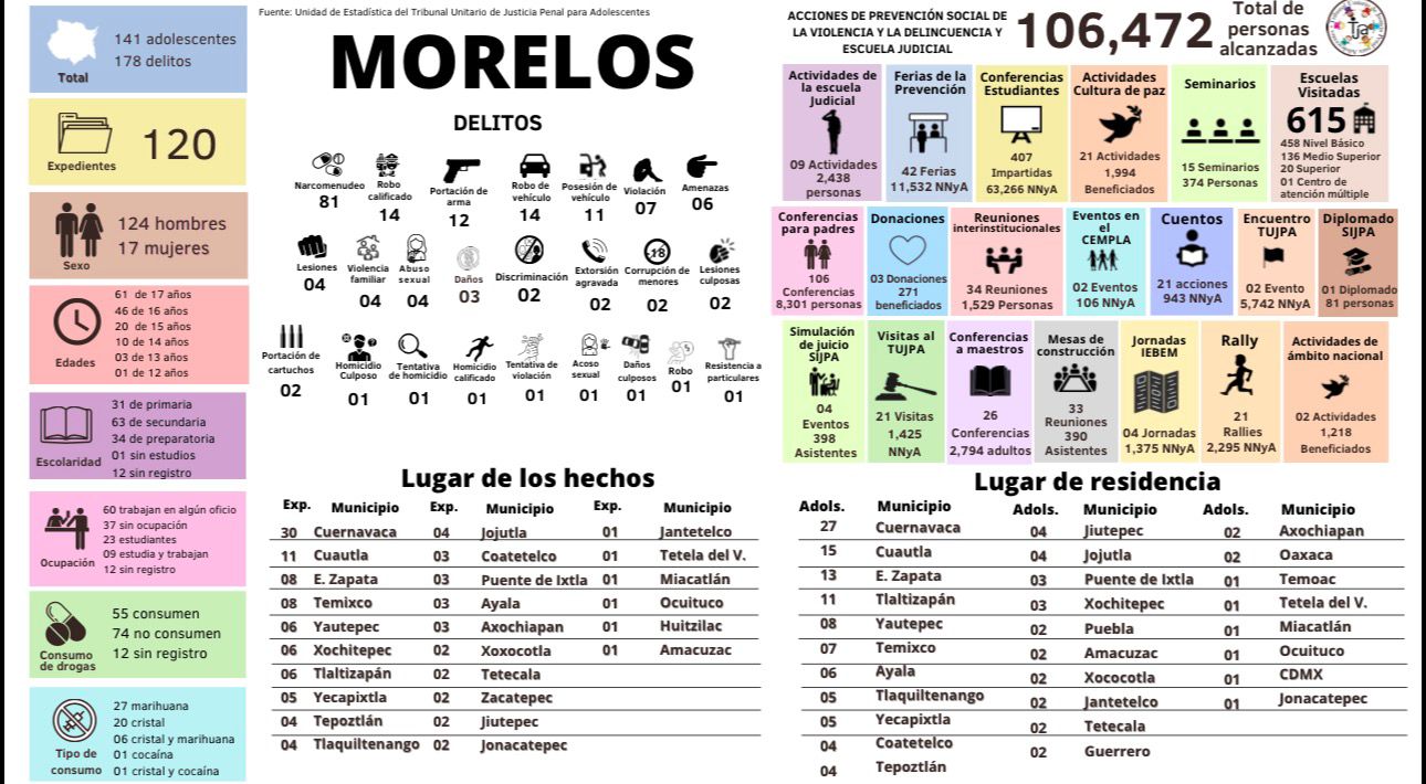 Durante el periodo de enero a diciembre de 2025, un total de 141 adolescentes estuvieron involucrados en 178 delitos en el estado de Morelos, de acuerdo con cifras de la Unidad de Estadística del Tribunal Unitario de Justicia Penal para Adolescentes (TUJPA).