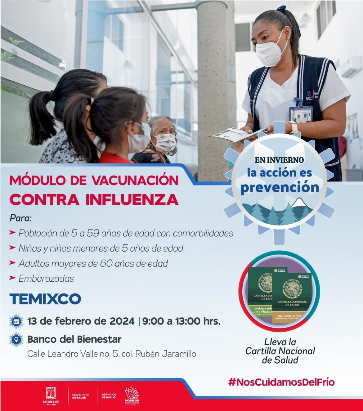 Rebeca Pérez Hidalgo, subdirectora de Salud Pública de SSM, detalló que el martes 13 de febrero, se instalará una brigada en el Banco Bienestar, en el municipio de Temixco, ubicado en la calle Leandro Valle, número 05, delegación Rubén Jaramillo, de 09:00 a 13:00 horas.